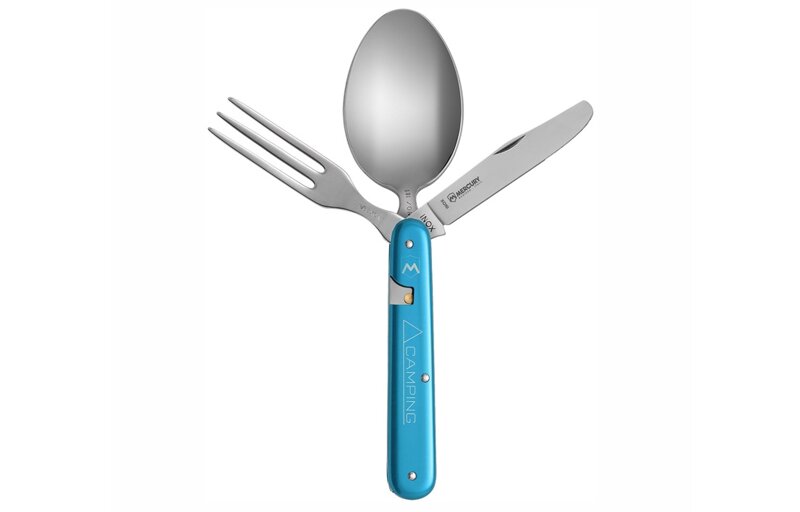 Posata da campeggio Mercury con cassa e 3 utensili in acciaio inox. Forchetta e cucchiaio in acciaio inox 18/8.